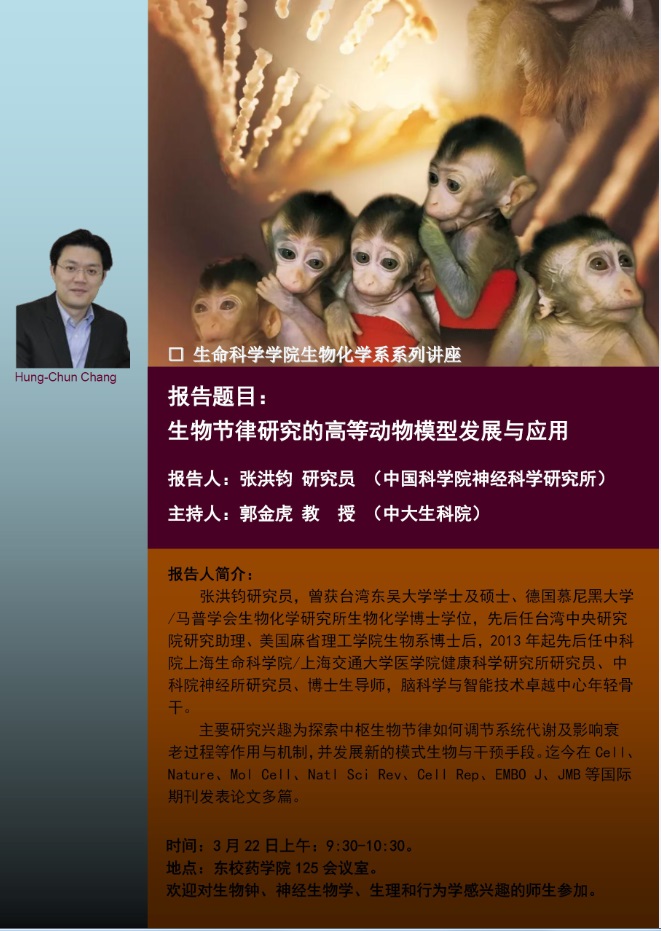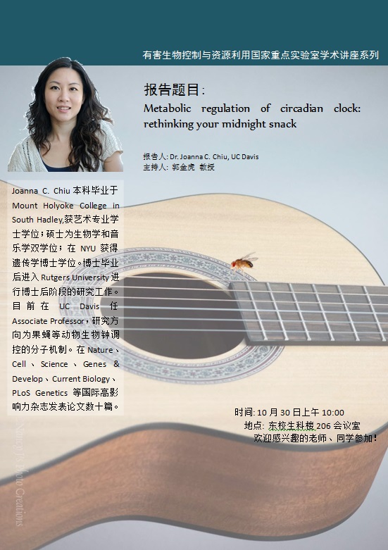 实验室重视学术交流活动,延请了国内外众多同行学者前来交流,包括美国生物节律研究会(SRBR)的两任主席Vanderbilt大学的Carl Johnson、Texas A&M的Paul Hardin、美国UT Southwestern Medical Center的Yi Liu、UC Davis的Joanna Chiu、原中国航天员中心主任现中国载人航天办公室副总设计师陈善广研究员等。实验室的学生也广泛出席和参加各种学术会议和交流活动,包括一些国际会议。以下为一些学术活动的海报。实验室PI郭金虎教授目前担任中国细胞生物学学会生物节律分会秘书长、中国空间科学学会空间生命起源与进化专业委员会副主任委员。郭金虎教授对于本科教学以及本科生课外科研训练非常重视,悉心指导。此外,实验室也重视科普工作,郭金虎教授出版的科普著作《生命的时钟》多次被中国科普作协和其他媒体推荐,多次为大众、中学生以及顺德杏坛镇青田组村民进行科普讲座,两次被中国细胞生物学学会评为科普先进个人。