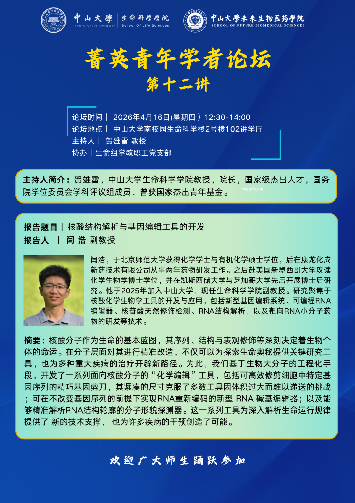 导航痕迹 色情小说网站 2026年4月16日菁英学者论坛第12讲:核酸结构解析与基因编辑工具的开发 扫描此二维码分享 2026年4月16日菁英学者论坛第12讲:核酸结构解析与基因编辑工具的开发 发布人:李晶 发布日期:2026-04-10 活动时间 2026年04月16日 12:30 - 2026年04月16日 14:00