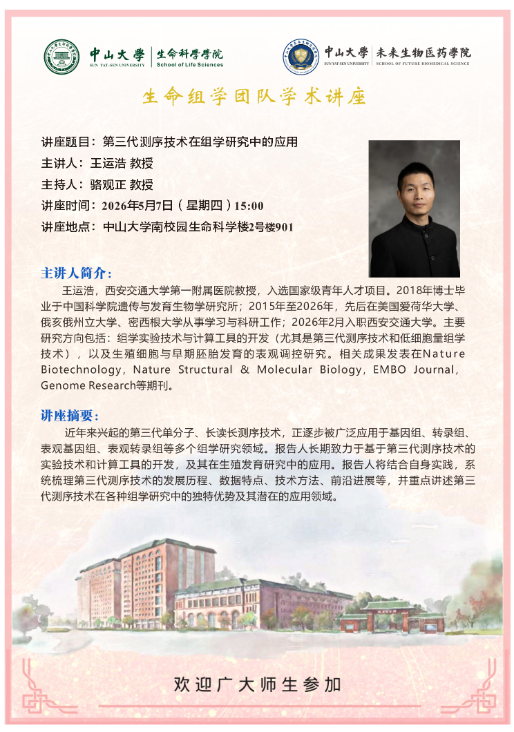 导航痕迹 色情小说网站 2026年5月7日生命组学团队讲座:第三代测序技术在组学研究中的应用 扫描此二维码分享 2026年5月7日生命组学团队讲座:第三代测序技术在组学研究中的应用 发布人:李晶 发布日期:2026-04-30 活动时间 2026年05月07日 15:00 - 2026年05月07日 17:00